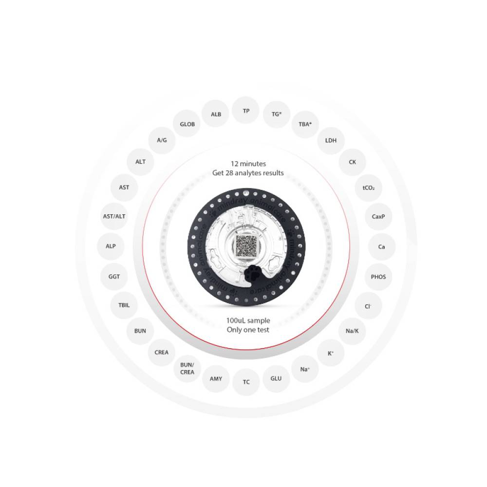 | Комплексна діагностична панель 28 показників | TP, ALB, GLOB, A/G, ALT, AST, AST/ALT, ALP, GGT, TBIL, BUN, CREA, BUN/CREA, AMY, TC, GLU, Na+, K+, Na/K, Cl-, PHOS, Ca, CaxP, tCO2, CK, LDH, TBA, TG |
