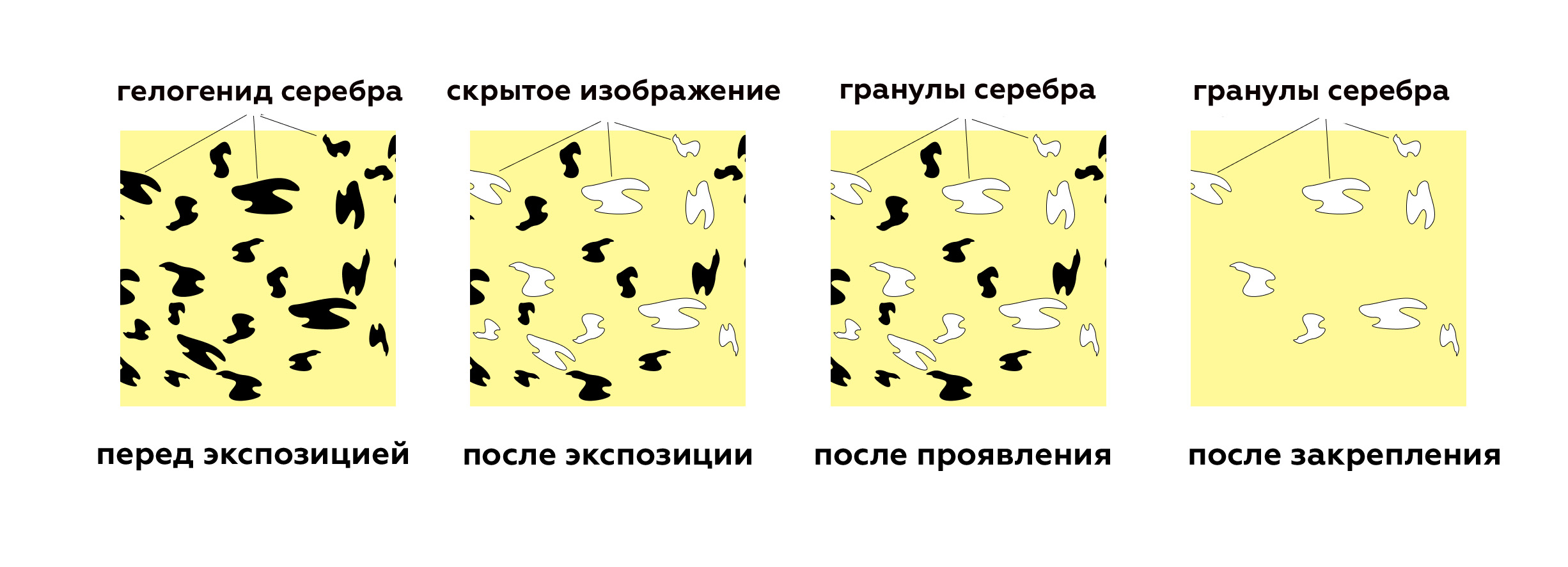 - Результат. Готовое изображение на пластиковой основе, где оттенки серого зависят от плотности зёрен серебра.