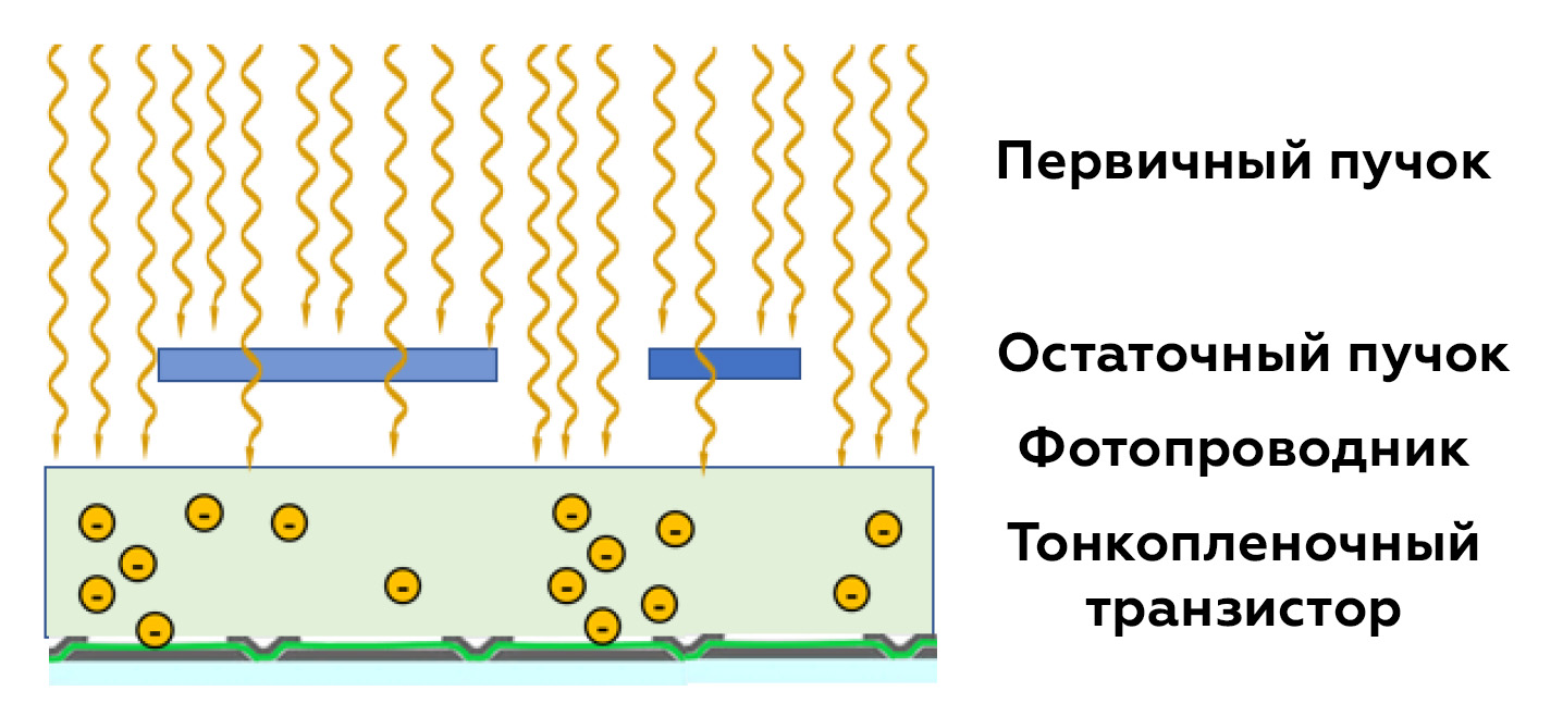 Рентгеновское излучение направляется на объект (синие блоки), который поглощает часть энергии. Остаточное излучение, прошедшее сквозь объект, несёт информацию о его внутренней структуре. Слой фотопроводника поглощает рентгеновские фотоны и непосредственно преобразует их в электрические заряды без промежуточного этапа создания света, как в аналоговой системе. Матрица транзисторов считывает эти заряды с каждого пикселя, формируя цифровое изображение, которое затем передаётся на компьютер.