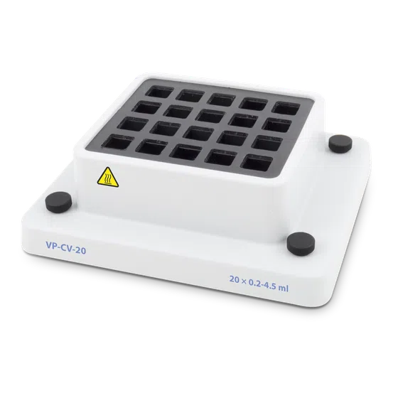 VP-CV-20 – для 20 кювет шириною 10 мм• Максимальні оберти: 1100 об/хв • Максимальна температура: 80 °C • Розмір гнізд блоку: 12,5 × 12,5 мм • Глибина гнізд блоку: 31 мм |