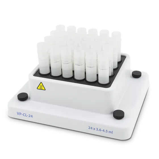 VP-CL-24 – для 24 кріопробірок об’ємом 3,6–4,5 мл • Максимальні оберти: 1300 об/хв • Максимальна температура: 100 °C • Діаметр гнізд блоку: 12,5 мм • Глибина гнізд блоку: 30 мм |