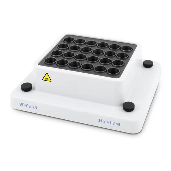 VP-CS-24 – для 24 кріопробірок об’ємом 1–1,8 мл • Максимальні оберти: 1400 об/хв • Максимальна температура: 100 °C • Діаметр гнізд блоку: 12,5 мм • Глибина гнізд блоку: 20 мм |