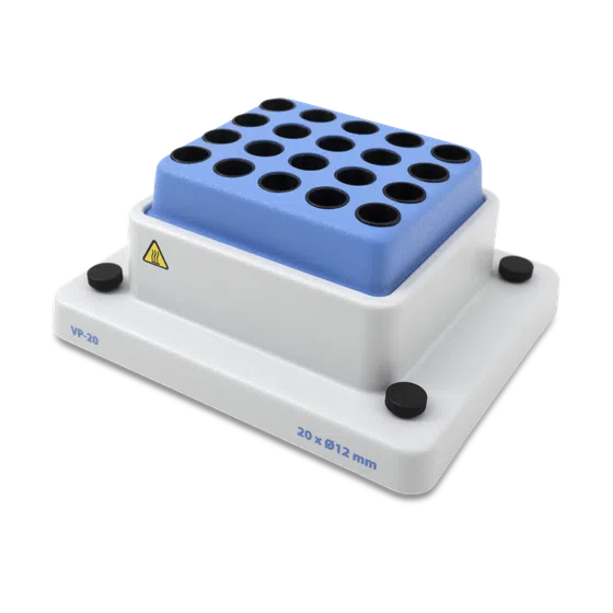 VP-20 – для 20 круглодонних пробірок діаметром 12 мм • Максимальні оберти: 1400 об/хв • Максимальна температура: 100 °C • Діаметр гнізд блоку: 12 мм • Глибина гнізд блоку: 50 мм |