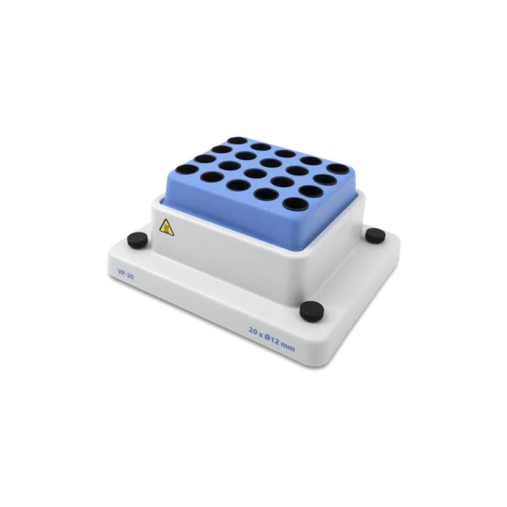 VP-20 – для 20 круглодонних пробірок діаметром 12 мм • Максимальні оберти: 1400 об/хв • Максимальна температура: 100 °C • Діаметр гнізд блоку: 12 мм • Глибина гнізд блоку: 50 мм |