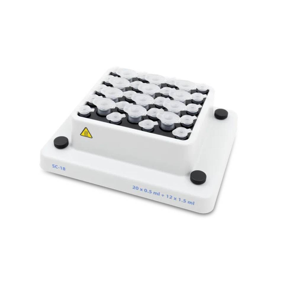 SC-18 – для 20 пробірок об’ємом 0,5 мл та 12 пробірок об’ємом 1,5 мл • Кількість пробірок 0,5 мл: 20 • Кількість пробірок 1,5 мл: 12 • Максимальні оберти: 1400 об/хв • Максимальна температура: 100 °C |