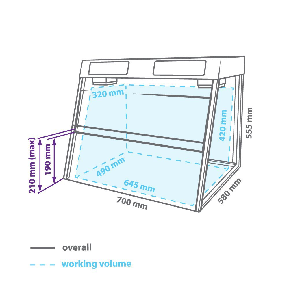 Прозорі скляні бічні панелі покращують огляд робочої зони та підвищують комфорт користувача. Конструкція виконана з матеріалів, стійких до УФ-випромінювання, з робочою поверхнею з нержавіючої сталі.