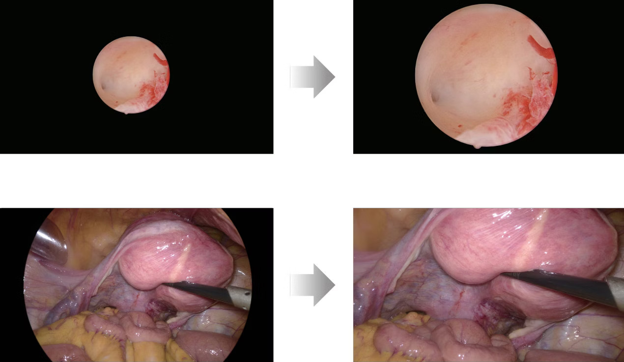 - Detail Enhancement (Покращення деталізації): алгоритм програмної обробки зображення підсилює контури деталей (судини, слизові складки, межі тканин), роблячи їх більш виразними без спотворення природної колірної гами.